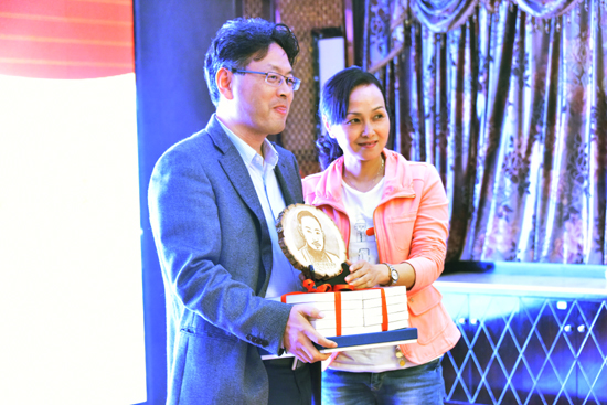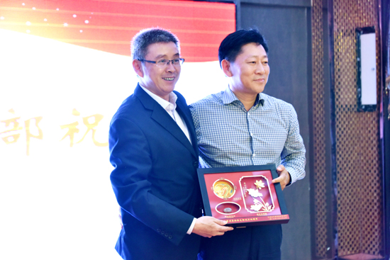 民盟江苏省委副主委吴胜兴向李公朴支部颁发了“纪念民盟江苏省委成立60周年先进集体”奖牌,民盟南京市建邺经济支部、民盟无锡机关委、民进常州市钟楼区基层委、德彩网科教城综合支部等友好单位向李公朴支部赠送凝聚着友谊和祝福的礼物,李公朴支部副主委许建国、陈汉兴、王昊,宣传委员翟建刚分别代表李公朴支部上台接受赠礼。