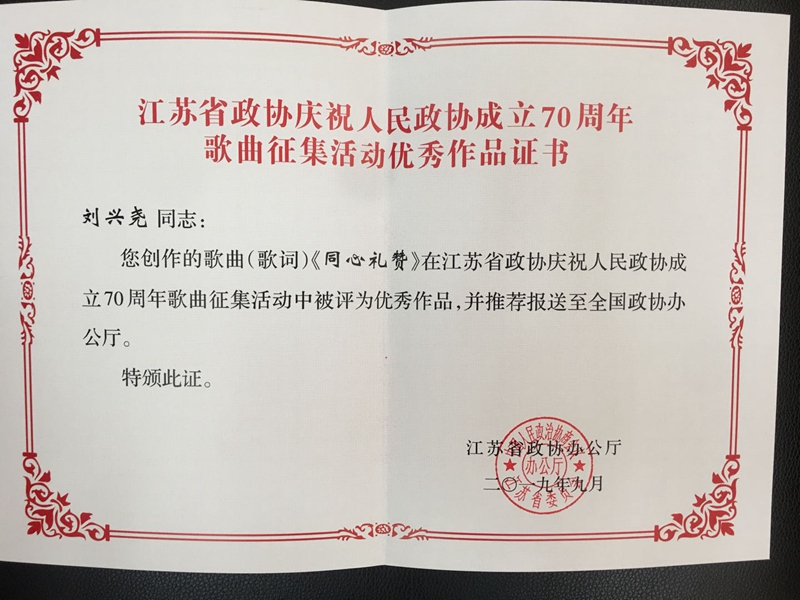 2019年9月,4位常州盟员在省政协组织的庆祝人民政协成立70周年歌曲征集活动中,作品被评为优秀作品,并推荐报送至全国政协。