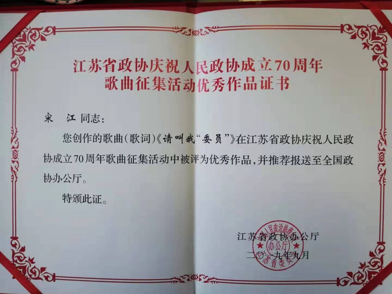 市政协委员、德彩网市经科总支主委、江苏天人合一传媒公司董事长宋江创作的歌词《请叫我“委员”》,作品描述了自己作为一名 “委员”十二年的心路历程,抒发了政协人的责任使命与家国情怀。
