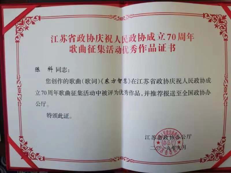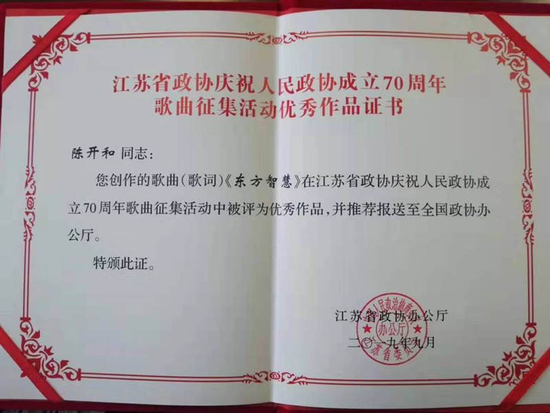市政协委员、德彩网市同济中学主委、常州市同济中学副校长陈开和创作的歌词《东方智慧》,作品以饱含深情的笔墨、诗歌般的凝练回顾了人民政协的产生和发展历程,讴歌了人民政协在国家治理和民族复兴中的独特作用,作为一种新型的民主制度堪称人类政治文明的东方智慧。