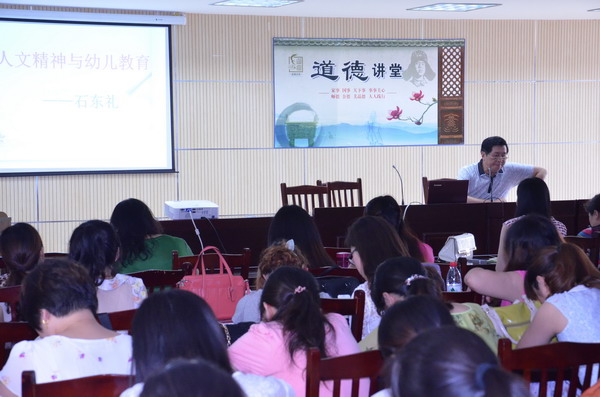 2014年7月3日下午,金坛市实验幼儿园举行了第五次道德讲堂活动,园内180名教工悉数参加。 本次道德讲堂邀请了中国书法家协会会员、金坛市书法家协会名誉主席、民盟原宣传处处长石东礼作专题讲座。石东礼以《人文精神与幼儿教育》为题,从金坛历史文化的源远流长谈到金坛人文精神的时代解读;从陈鹤琴的“活教育”思想引发对幼儿教育真谛的思考;从我园六十年的发展轨迹探寻区域文化与幼儿教育的契合。一个个名家故事娓娓道来;一首首名人诗词脱口而出。他充满激情的讲述,诙谐幽默的表情不时引得台下阵阵欢笑;他引经据典、博古论今的学识风范赢得一次又一次的掌声。 “从实从严,不骄不躁;大处着眼,小处着手;锲而不舍,蹊径自辟;独立思考,穷理寻真!”这是世界著名数学家华罗庚的自勉诗,石东礼先生把它精心创作成一幅书画作品送给了校园,表达了一位老校友对母校六十年华诞的祝福与感恩之情。(马莉)