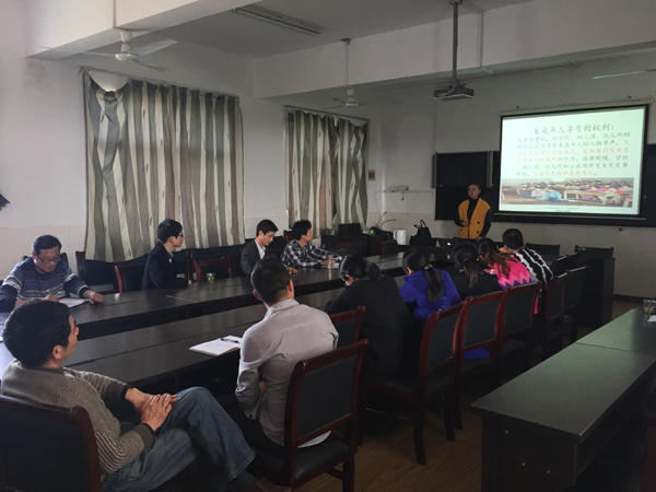 负责本次主讲的是金坛市法商荟法律咨询服务中心的联盟律师杨贞。她本着中共中央提出的“依法治国”基本方略,通过列举一些大众生活、特别是校园生活中的典型案例,同在座的老师们展开普法宣传和问答互动。在讲座中,杨贞律师还穿插进《乡村爱情》、《西游记》等元素,进行趣味案例问答,其深厚的律法素养和别出心裁的表达方式活跃了全场气氛,大家纷纷各抒己见,从身边的法律实例出发,进行了热烈的讨论。