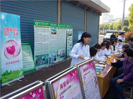 4月18日,为了响应第二十二届全国肿瘤防治宣传周活动,民盟新北综合一支部联合新北区疾控中心在龙虎塘街道盘龙社区开展主题为“科学抗癌、关爱生命——癌症防治,我们在行动”的社会公益义诊活动。 高级心理咨询师、盟员金建红现场接受社区居民和肿瘤患者的咨询,对于肿瘤患者鼓励其接受患病事实、重建自信、积极配合治疗;对于中风患者鼓励其不要错过最佳康复期,坚持训练,永不放弃。薛家医院护士长、盟员金礼娟对测量中发现的血压偏高者、高血压患者进行了登记,并对日常饮食、运动进行了指导,嘱其定期测量血压、规范服药。新北区疾控中心综合防治科副科长、盟员朱婷现场发放健康宣传资料,全面进行肿瘤科普知识宣传,呼吁全社会积极参与关爱生命、科学防癌。 本次活动现场共免费测量血压100余人、测量血糖70余人,发放健康教育处方、宣传画册等资料800余份,受到了社区群众特别是老年朋友的热烈欢迎与一致好评。这也是民盟新北综合支部连续第四次开展的公益义诊活动。 (朱婷)