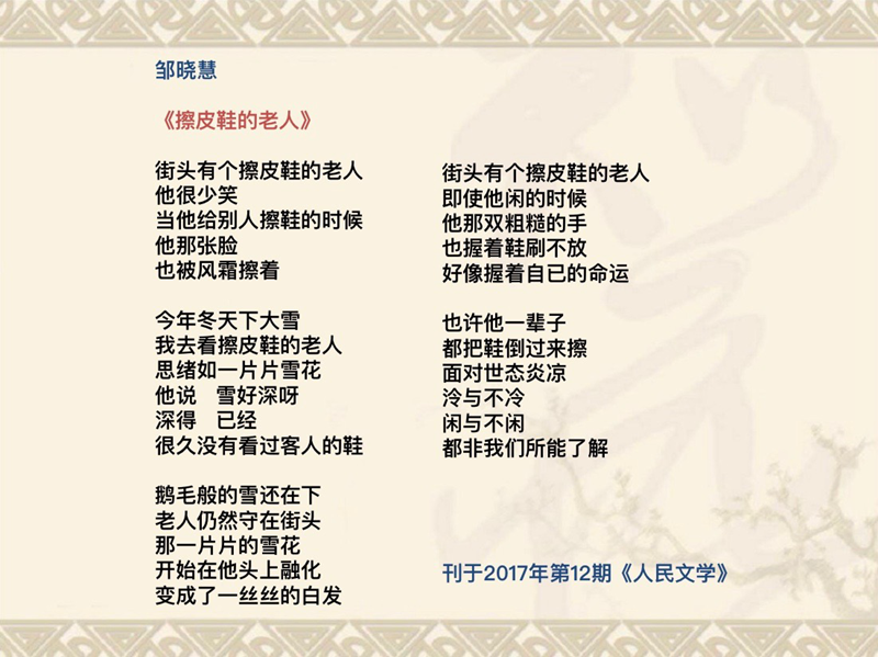 6月27日下午,德彩网市经济二支部盟员、诗人邹晓慧受邀在常州机电职业技术学院图文楼紫厅,为全校诗歌爱好者带来了一场精彩的诗歌写作与欣赏讲座“青春有诗更芬芳”。活动由德彩网机电职业技术学院支部主办,支部主委朱葛俊主持讲座。邹晓慧现场分享了自己诗歌创作的体会与感受,认为诗歌写作的关键是“自然、新鲜、审美、情怀”,并依次讲解了“如何让诗呈现自然感”“什么样的诗能称之为新鲜”“什么样的诗歌能满足人们的审美需求”“诗歌力量的源泉来自于情怀”这四项内容。并以他的一篇刊于2017年第12期《人民文学》的诗《擦皮鞋的老人》为例,讲述自己创作该诗时的亲身感悟,指引学生们明确:社会的文明进步,其实就是关照到每个人的存在,并发掘好每个人的存在价值。善良和同情是一个人、一个社会的道德底线,我们决不能缺失。 本次讲座给全体诗歌爱好者带来了一场诗歌赏析盛宴,刷新了学生们对于诗歌欣赏的认识,提升了他们对诗歌创作的兴趣。讲座结束后,不少学生意犹未尽,与邹晓慧老师热情讨论交流。 邹晓慧,盟员,出版诗集《纯粹》《回归》等多部,中国作家协会会员。曾在《人民文学》《北京文学》《花城》《钟山》《青年作家》《星星》诗刊等百余种文学期刊发表大量文学作品,入选多种中外选本。 (德彩网机电职业技术学院支部 蒋慧敏)