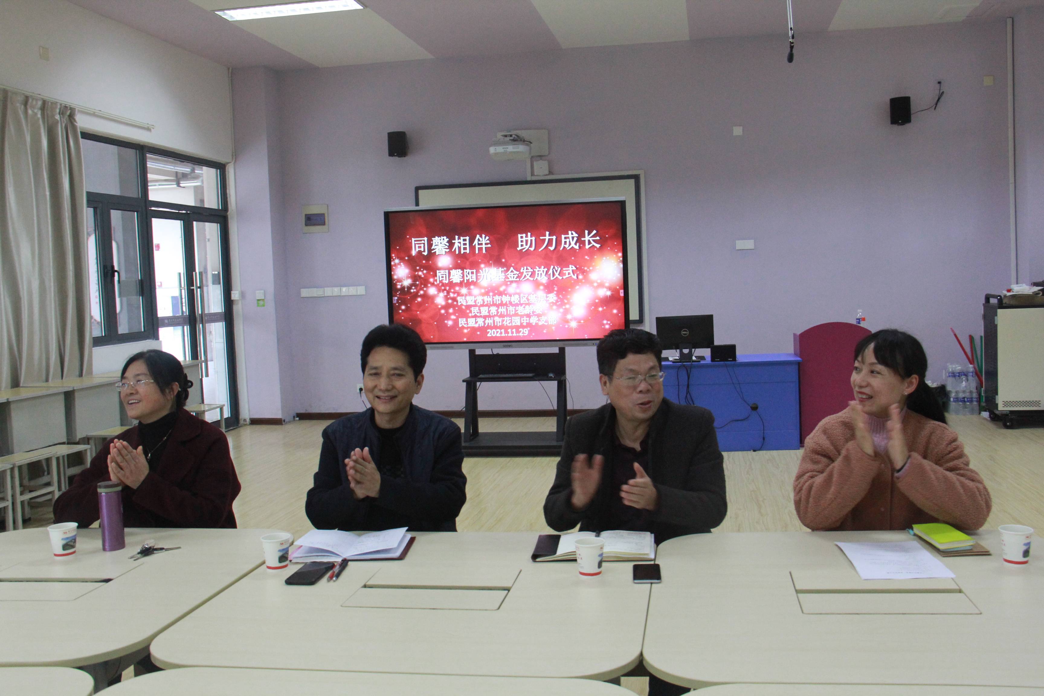 11月29日下午,钟楼区民盟基层委“同馨阳光基金”发放仪式在花园中学梦想教室里举行。德彩网市委副主委、钟楼区人大常委会副主任、民盟钟楼区基层委主委黄勇,常州市花园中学党支部书记张海涛,德彩网市花园中学支部主委陈萍,德彩网市委老龄委代表厉雅珍老师等应邀出席本次活动。会议由民盟花园中学支部副主委李雯主持。