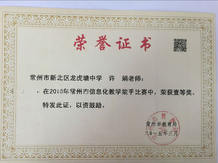 近期获悉,在2015年常州市信息化教学能手竞赛中,代表新北区龙虎塘中学参赛的新北综合二支部副主委许娟以出众的表现荣获语文组一等奖。 许娟老师从事语文教学多年,潜心钻研、自我砥砺,教学技艺日臻成熟,连续多年获得校青年教师评优课一等奖,区学科竞赛一等奖,青年教师演讲比赛一等奖,校班主任基本功竞赛一等奖,并且曾担任过多个国家级、省级课题负责人, 2013—2014年度被评为全国教育科学“十二五”课题“‘少教多学’在中小学语文教学中的策略与方法研究”课题优秀教师,多次开设区级、市级、省级公开课,受到高度的认可和肯定,并多次获得新北区嘉奖,也因此获得了新北区“德育先进个人”、校“学生最喜爱的班主任”等多项殊荣。(王培琦、于玉婷)
