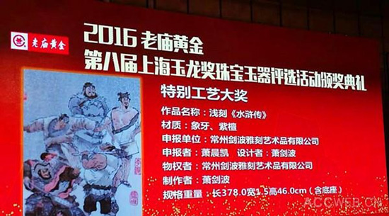 5月3日,从第八届上海玉龙奖颁奖典礼上传来喜讯,武进盟员、工艺中国签约艺术大师萧剑波荣获最高奖项之一的“特别工艺大奖”!其获奖作品为“浅刻《水浒传》”。他是有史以来第一位、也是当代唯一的浅刻类国家级大师,曾获得“江苏省2015中华文化人物”称号、荣登《华人艺术家》封面。 由上海宝玉石行业协会主办的2016老庙黄金第八届上海“玉龙奖”珠宝玉器作品评选于4月29日—5月3日在上海城隍庙的老庙黄金银楼举办,由玉雕和牙雕两个门类一起参展评选。本届“玉龙奖”评选主题为“中华梦·玉雕情”,并创新性的把象牙雕刻纳入展评,这无疑是对牙雕艺术的肯定,并对弘扬古老牙刻技艺起到了积极作用。最终参与评选的牙雕、玉雕作品近千件,品种涉及多个门类,为历史之最。评选过程及参展标准亦是延续了往届之严格,本着“选料要精,工艺要高,创意要新,总体要美”的总要求,在坚持作品原创性、创新性和引领性的基础上,强调作品的创意、雕刻工艺和材质运用。 牙刻紫檀屏风《水浒传》,是萧剑波大师继《三国演义》之后的又一件鸿篇匠心巨作。作品全长3.78米,高46厘米,由21扇象牙紫檀屏风组合而成。以60余万字的《水浒传》全文微刻为灰色背景,烘托出108位个性鲜明的水浒英雄人物,辅以108枚金石名章,熠熠生辉。该作品既是中华古老象牙浅刻艺术精湛技艺的完美呈现,也是传统工艺与传统书画文化的完美融合。同时,小牙刻的大题材、大系列、大气魄、大气象,更完美展现了震撼的视觉冲击力。历时5年时间,萧剑波大师倾心打造,谨以此作向“工匠精神”致敬。(顾晓霞转)