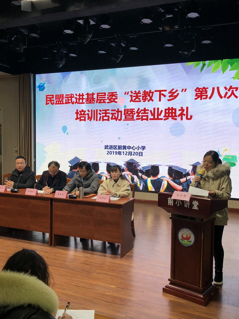 2019年12月下旬,民盟武进基层委“送教下乡”第八次培训活动暨结业典礼分别在前黄中心小学、寨桥小学、李公朴小学举行。武进区教师发展中心秦春华主任、民盟武进基层委万琴凤、教育支部主委董建文以及市优秀盟员薛群年、壮亚芬、薛博娟等参加了相关活动。