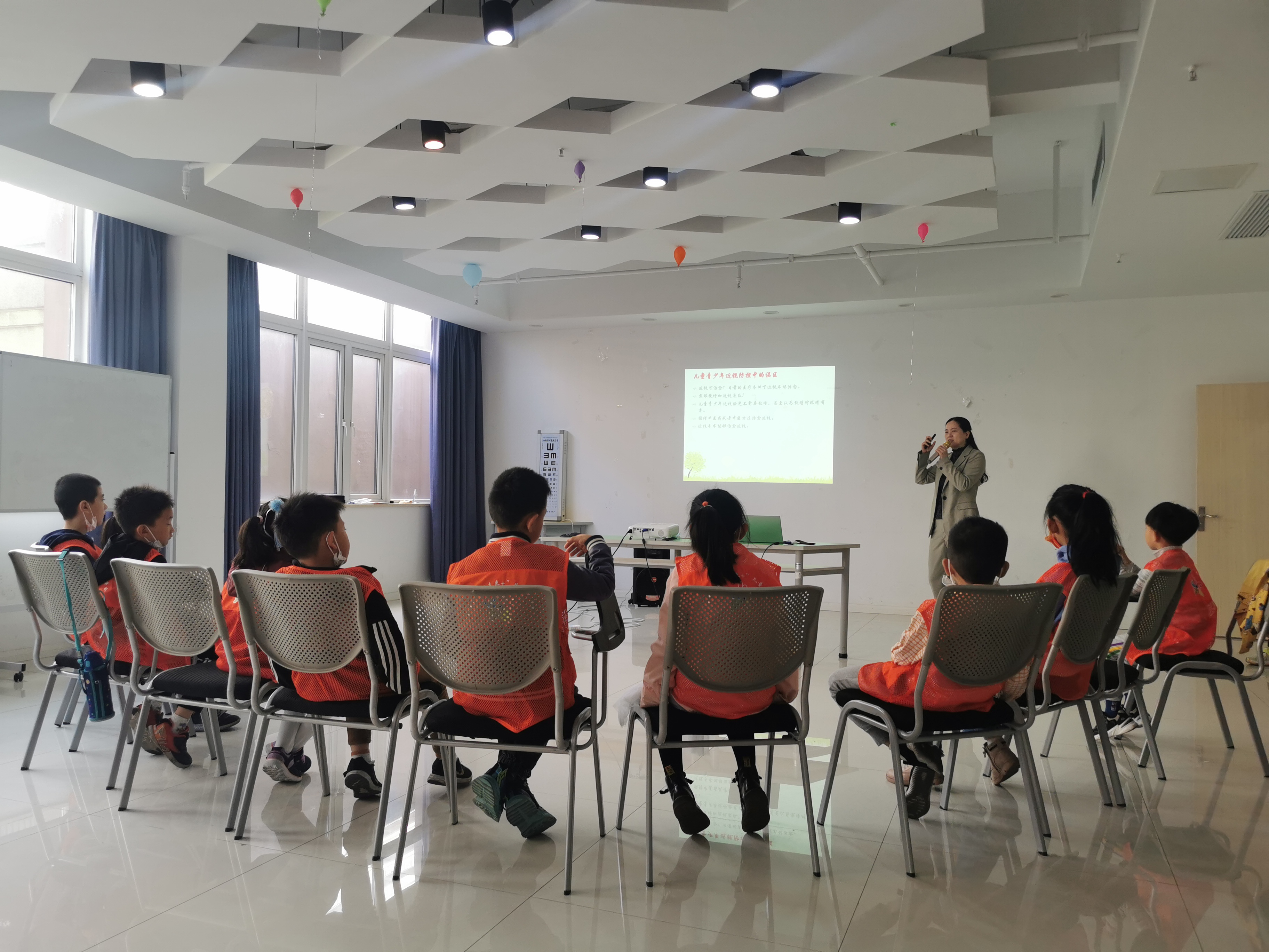 民盟新北综合三支部的盟员阮佩英医生,为孩子们讲解了爱眼、护眼小知识,并通过你问我答”“蒙眼游戏等有趣的互动方式,生动形象地让他们了解眼睛的作用、近视眼是怎样形成的以及如何预防近视眼等知识。通过近距离沟通和交流,引导孩子们积极养成正确做护眼操、不用脏手揉眼睛、保持正确坐姿看书、不长时间玩电子产品和观看电视、多进行户外运动等好习惯。孩子们听得非常认真,阮医生还给孩子们一一测试了眼睛,这次活动受到了孩子和家长们的一致好评。