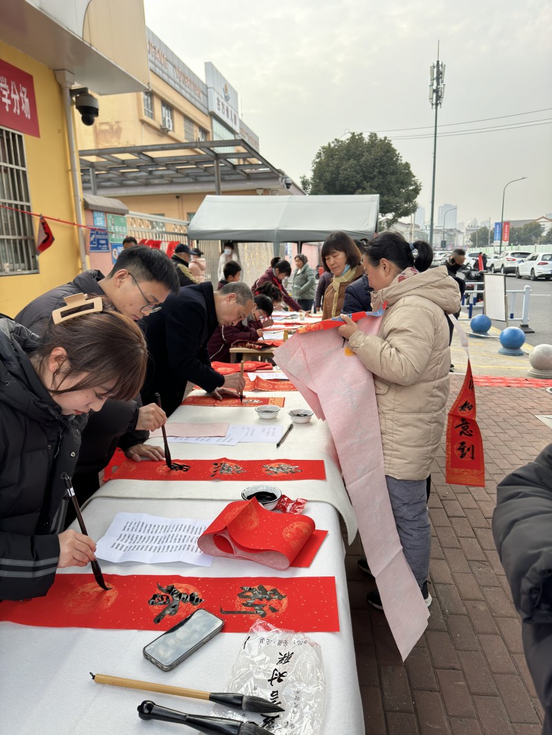 “玉兔辞旧岁,祥龙迎新年”,随着春节的脚步越来越近,节日的氛围也感染着我们每一个人。为传承中华优秀传统文化,营造温馨、舒心、喜庆的过年氛围,元月17日下午,民盟李公朴支部与古方路社区联合邀请了常州市文联副主席蒋志文、常州市青年书法家协会主席贾韬、顾问周其雪、副秘书长吕云与计梦娇、办公室主任范千里、会员吕明杰与张玉静,共同举办了春联惠民活动,并偶遇了 “2024常州市百校送福迎春”人民路小学分场活动,大家一起把祝福送到群众身边。 长桌排开,笔墨铺就。书法家们在活动现场为群众挥毫泼墨,笔走龙蛇,专心书写着春联内容。一支支毛笔,一方方墨碟,起承转合之间,书写工整、如行云流水般流畅的对联跃然纸上,一副副满载祝福的春联便呈现在大家眼前,活动现场洋溢着新年的喜庆氛围,荡漾着墨汁的扑鼻芳香。 浓浓邻里情,冬日暖人心。不少邻里群众一边兴致勃勃地欣赏,一边兴高采烈地挑选“福”字与春联,老人们拿着一副副寓意喜庆、饱含祝福的春联喜笑颜开,对工作人员表示了诚挚的感谢。 此次活动的举办,不仅为群众送上了温暖且美好的新年祝福,还营造了健康祥和、积极向上的文化氛围,更是让大家深刻感受到了中华传统文化的精髓与魅力。 (冯馨烨)